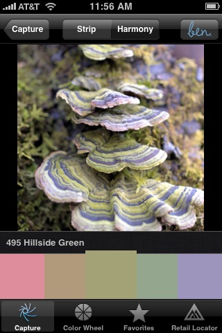 Paint color, and how to choose a good one to match the <-insert decorating variable here, i.e. “throw pillow, native american pottery, toilet seat cover-> is a common theme around my house. So common, in fact, that I keep a fresh bottle of Benadryl close at hand to deal with the case of hives I get every time the subject comes up. That’s why I was psyched to find the Ben iPhone app in a recent issue of Sunset Magazine.
