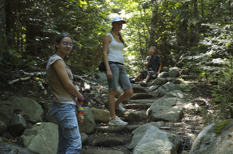 The Adirondack Loj trailhead was as wide as a super hi-way and nearly as crowded, although most of the people we saw were walking in the opposite direction. In all Kathy and I figure that we saw about 50 people on the trail, including two groups of 10+ kids that were part of a local camp. Even with the crowds the trail was beautiful. The evergreens gave it both the smell and the feel of Twain Harte, where I spent all of my summers as a kid, and every turn revealed a different vista, from stone steps to a slow-running but beautiful waterfall.