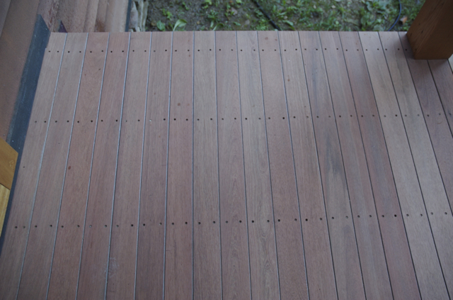 What resulted from the redwood Penofin on mahogany decking was a very yummy, deep purple-ish color that would almost make think that the porch was purple heart. Really beautiful!