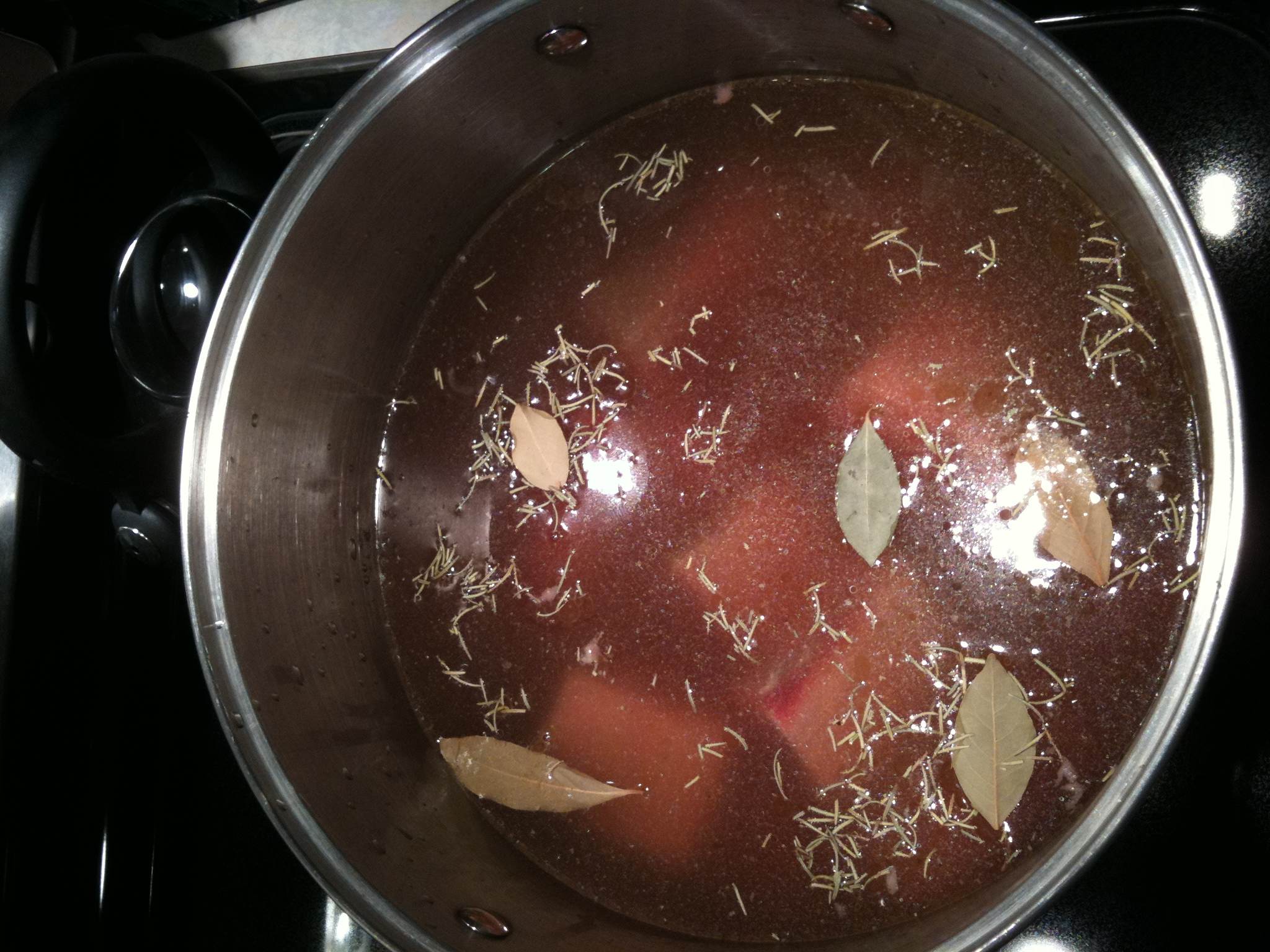 We simmered for four hours with some short ribs, dried thyme, and bay leaves.