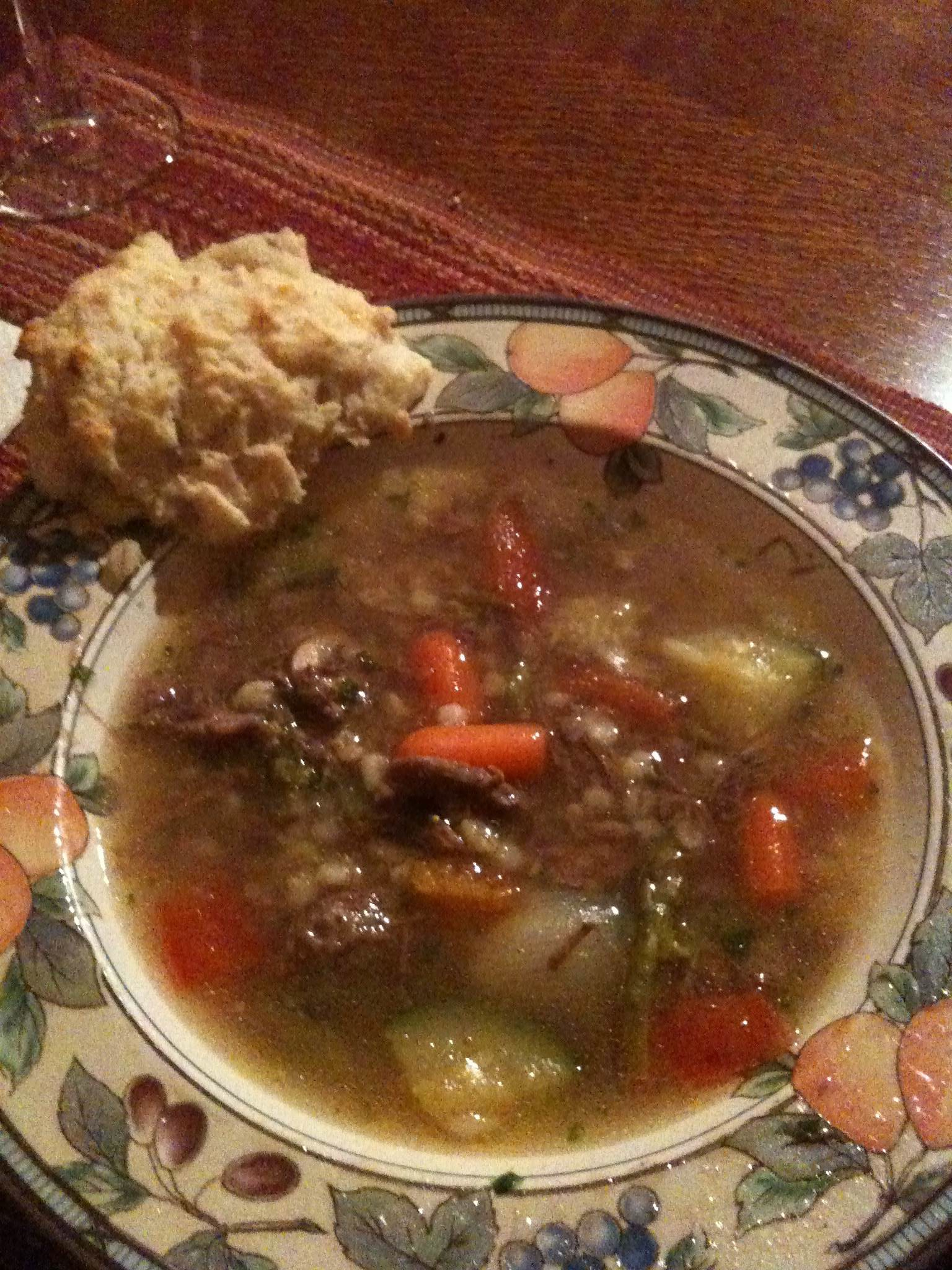 When the simmering finished we stripped the meat from the bones, added some cooked barley, and shallots and mushrooms we’d sauteed and then finished with Sherry. The end result… delicious!