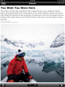 The one app that I’m supremely impressed with is Outside Magazine’s iPad Edition, which seems to me to have spanned the gap between print and digital editions in a pretty stellar fashion. The quality of the text mirrors that of the magazine and, while I think that as they continue to work on the layout it will only get better, I feel that in its present state it’s already a pretty darn good replacement for the print edition and one that I’d gladly subscribe to in a digital format. It also appears that Outside has designed this version to work in the way that I hoped iPad-based magazines would work, a single application with which you’re able to easily access older issues of the magazine and your latest issue without having to download a separate application every time a new issue is release. I’ll also add that the quality of the photography in the iPad edition is stunning. There’s a depth to it that you just can’t get in a print magazine and it’s truly beautiful to look at.